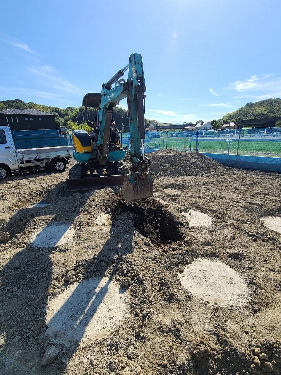 基礎工事着工ー海南市 2023.09.26 最終更新日時 : 2023.09.26 紀北地所株式会社 本日は、岩出市から飛び出して海南市にて工事着工です(^o^) まずは地鎮祭の時に頂いた鎮め物を納める所からです。 地面に〇があるところが地盤改良工事のコンクリート杭です。 地面を掘削した部分に方位を合せて鎮め物を納めました。 H様邸の新築工事がスタートです! H様邸の新築工事がスタートですっ! H様、楽しみにしていてくださいね(^^♪ ご近隣の皆様もこれからよろしくお願いします!