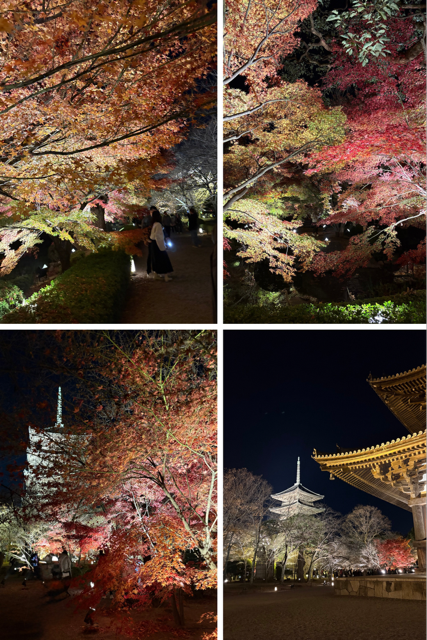 境内にはたくさんのイチョウや紅葉もライトアップされていて、黄金色と深紅の彩りがすごくきれいで、