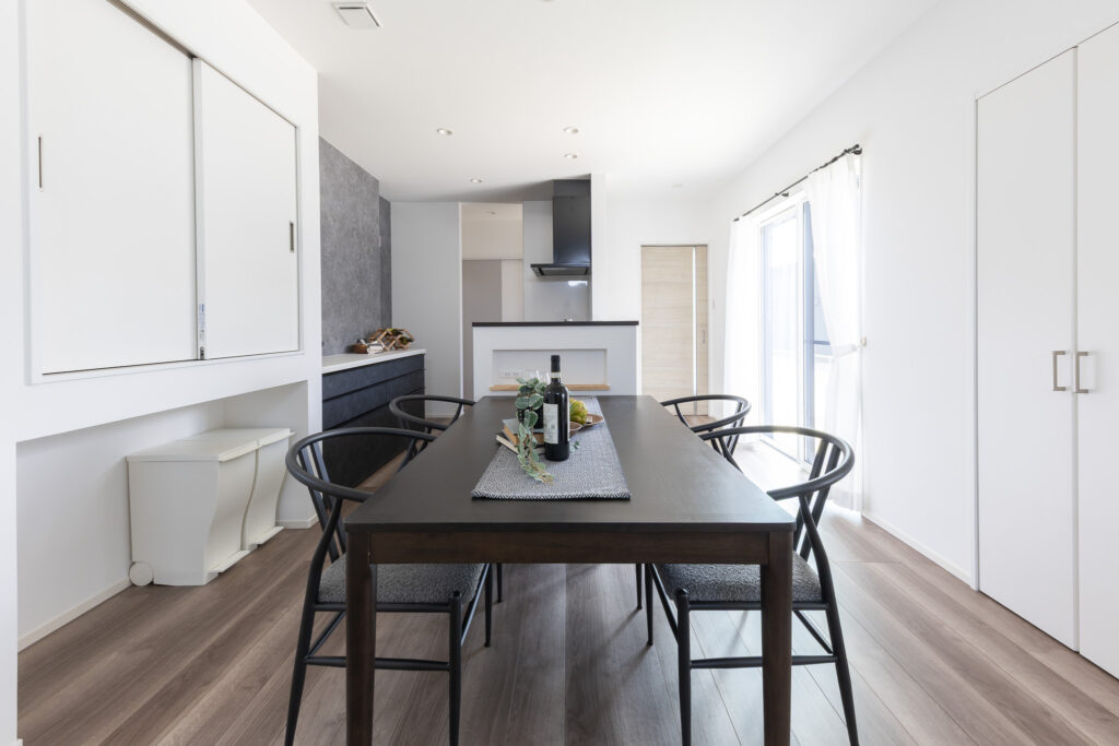 シックな色目でまとめられたLDK。20坪のLDKと4.5畳の和室。