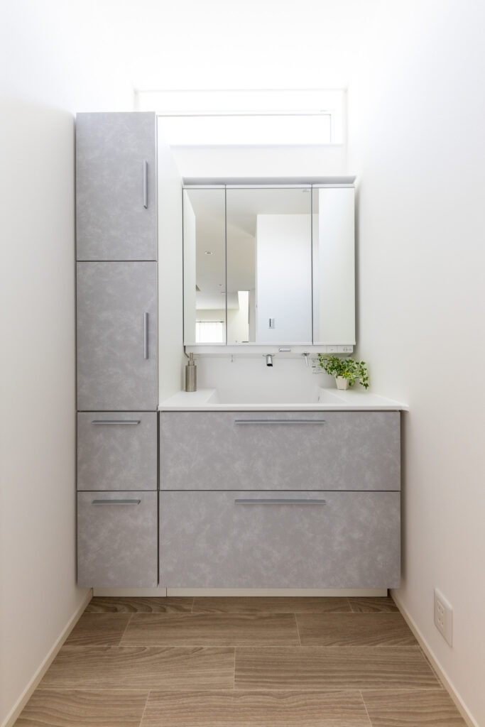 洗面はLIXILのクレヴィ。機能性とデザインにこだわった洗面台です。